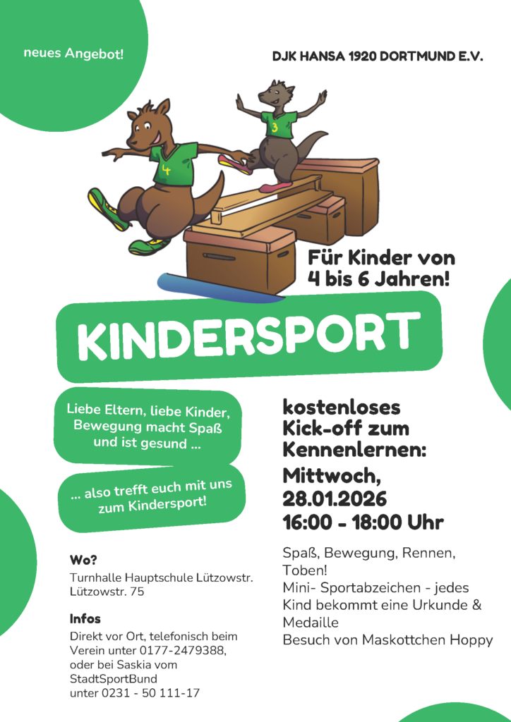 Das reguläre Sportangebot der DJK Hansa findet immer mittwochs von 16:15 bis 17:15 Uhr in der Turnhalle an der Lützowstr. 75 statt. Neue Kinder sind jederzeit herzlich willkommen.